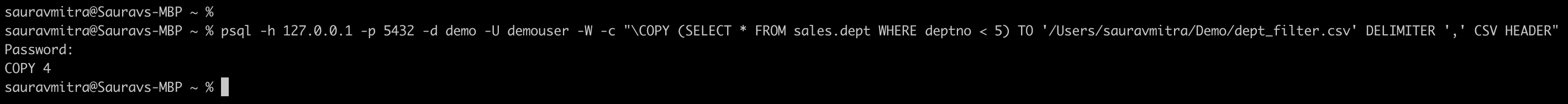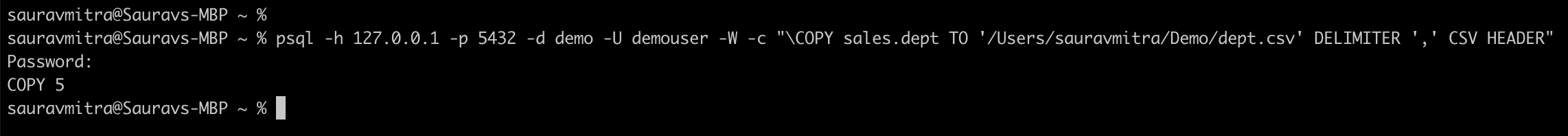 psql -h 127.0.0.1 -p 5432 -d demo -U demouser -W -c "\COPY sales.dept TO '/Users/sauravmitra/Demo/dept.csv' DELIMITER ',' CSV HEADER"