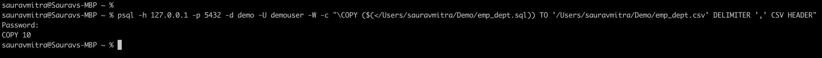 psql -h 127.0.0.1 -p 5432 -d demo -U demouser -W -c "\COPY ($(</Users/sauravmitra/Demo/emp_dept.sql)) TO '/Users/sauravmitra/Demo/emp_dept.csv' DELIMITER ',' CSV HEADER"