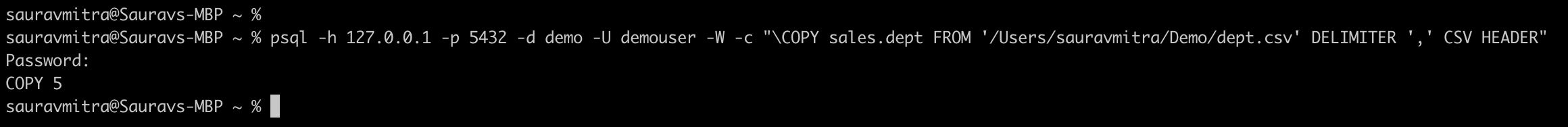 psql -h 127.0.0.1 -p 5432 -d demo -U demouser -W -c "\COPY sales.dept FROM '/Users/sauravmitra/Demo/dept.csv' DELIMITER ',' CSV HEADER"