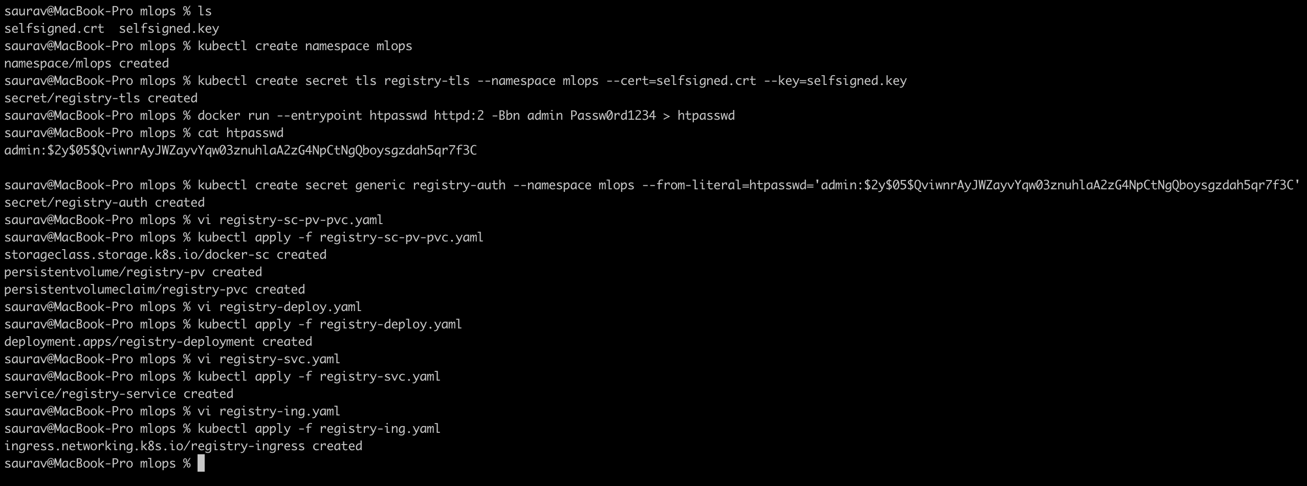 kubectl create secret generic registry-auth --namespace mlops --from-literal=htpasswd='admin:$2y$05$QviwnrAyJWZayvYqw03znuhlaA2zG4NpCtNgQboysgzdah5qr7f3C'Create Persistent Volumes