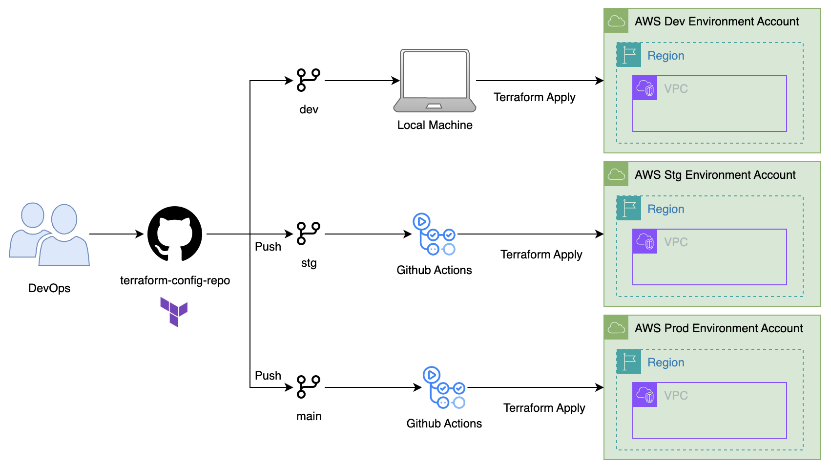 - The workflow then assumes the role in the corresponding AWS environment account to manage infrastructure.