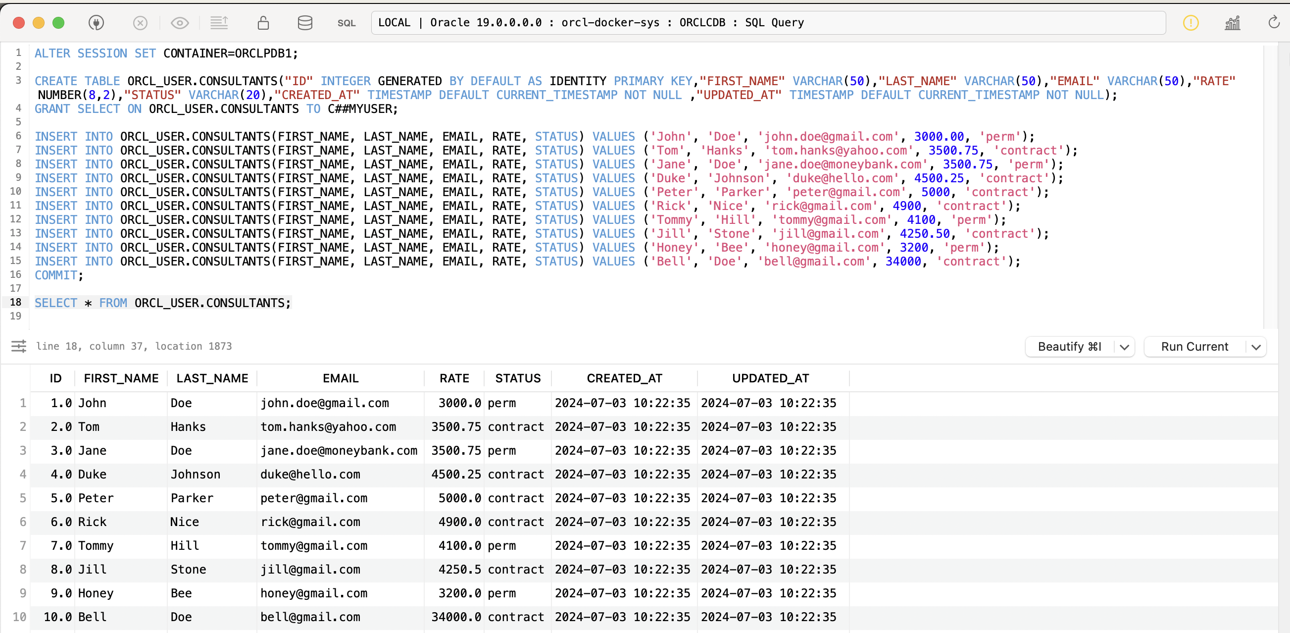 INSERT INTO ORCL_USER.CONSULTANTS(FIRST_NAME, LAST_NAME, EMAIL, RATE, STATUS) VALUES ('Tim', 'Smith', 'tim.smith@freelance.com', 3500.70, 'contract'); COMMIT;