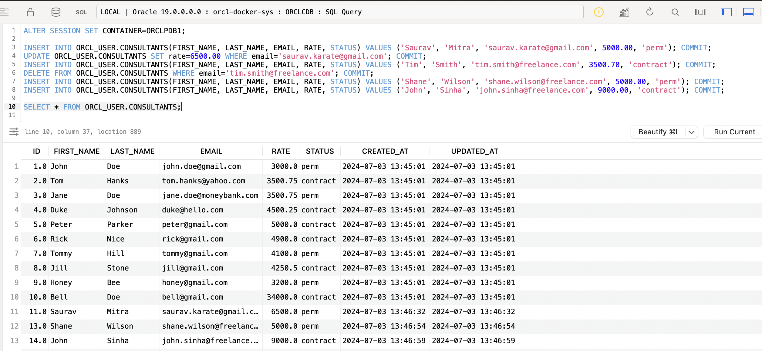 UPDATE ORCL_USER.CONSULTANTS SET rate=6500.00 WHERE email='saurav.karate@gmail.com'; COMMIT;